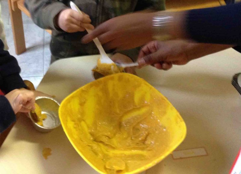 Rossi e arancioni oggi si sono sperimentati nei muffin alla zucca con olio EVO all’arancia Zucchi, mentre verdi e gialli hanno optato per dolci di castagna ricoperti di cioccolato e formaggio, pere e noci! Il lavoro è stato tanto: sbucciare, mescolare, tagliare, impiattare, dosare, misurare… fare i cuochi è impegnativo, ma durante il laboratorio di cucina impariamo tante cose… A noi piace, alle maestre pure! E poi si mangiano cose buonissime, stuzzicanti e sfiziose!