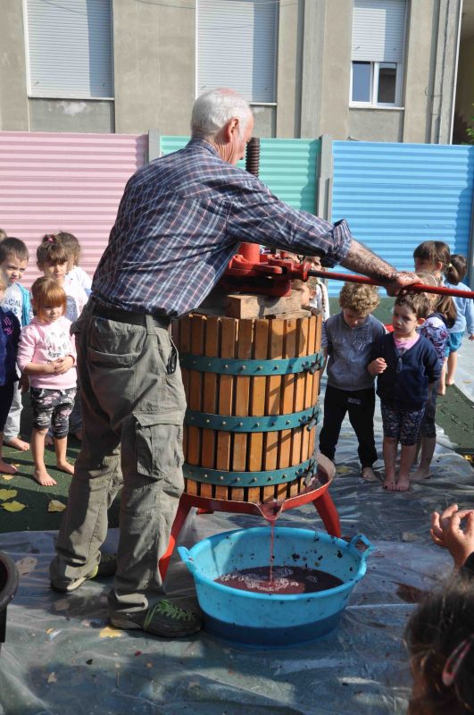 12 ottobre: a scuola arriva Samuele. Lui è un esperto di viti, uva e pigiatura! Ha una piccola vigna vicino a Po e tutti gli anni pigia l’uva e la maestra Giulian (sua moglie) poi prepara il budino con il succo! Samuele ci ha portato anche il torchio e ci ha fatto vedere come funziona!